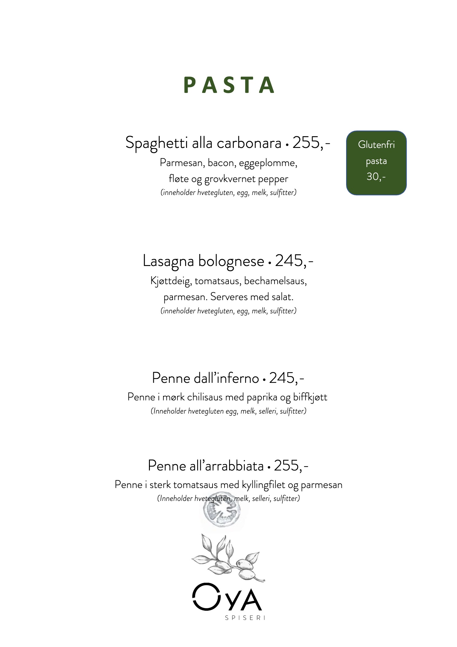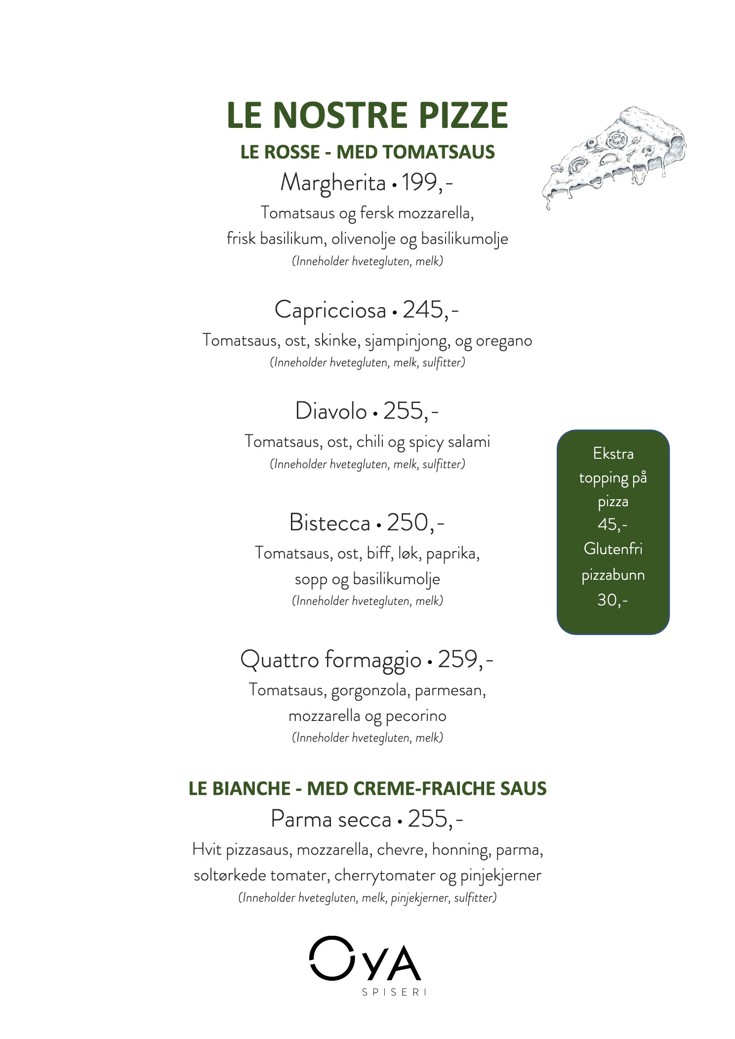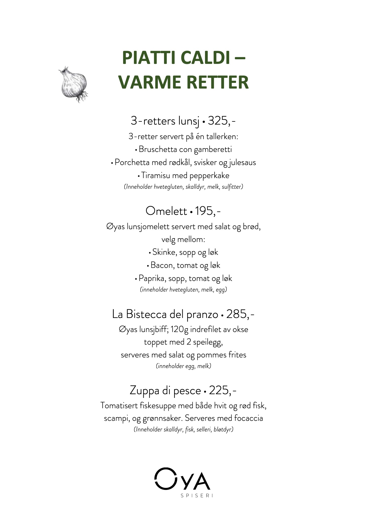 Menyer for Øya SpiseriHer finner du våre aktuelle menyer. Se bilder under eller last ned pdf.MenyTavleretter JulLunsjmenyDrikkeLast ned meny i pdf format her. Last ned meny i pdf her og dessertmeny her. Last ned lunsjmeny i pdf format her.